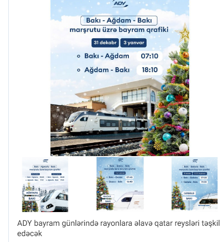 Bildirilib ki, 31 dekabr və 1, 2, 3 və 4 yanvar tarixlərində Bakı-Qəbələ-Bakı, 1, 2 və 4 yanvar tarixlərində Bakı-Qazax-Bakı, 30 və 31 dekabr, eləcə də 1, 2, 3 və 4 yanvar tarixlərində Bakı-Ağstafa-Bakı, 31 dekabr və 3 yanvar tarixlərində Bakı-Ağdam-Bakı marşrutları üzrə qatarlar hər iki istiqamətdə hərəkətdə olacaq.
