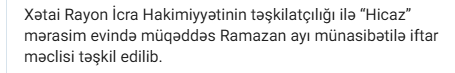 27 fevral 2026-cı il tarixində Xətai Rayon İcra Hakimiyyətinin təşkilatçılığı ilə “Hicaz” mərasim evində müqəddəs Ramazan ayı münasibətilə iftar məclisi təşkil edilib. Tədbirdə rayon İcra Hakimiyyətinin başçısı Rafiq Quluyev, Milli Məclisin deputatları Vüqar Rəhimzadə və Pərvanə Vəliyeva, YAP Xətai rayon təşkilatının sədri Ramil Mirzəyev, rayon hüquq-mühafizə orqanlarının rəhbərləri, şəhid ailələrinin üzvləri, qazilər və ictimaiyyət nümayəndələri iştirak ediblər.