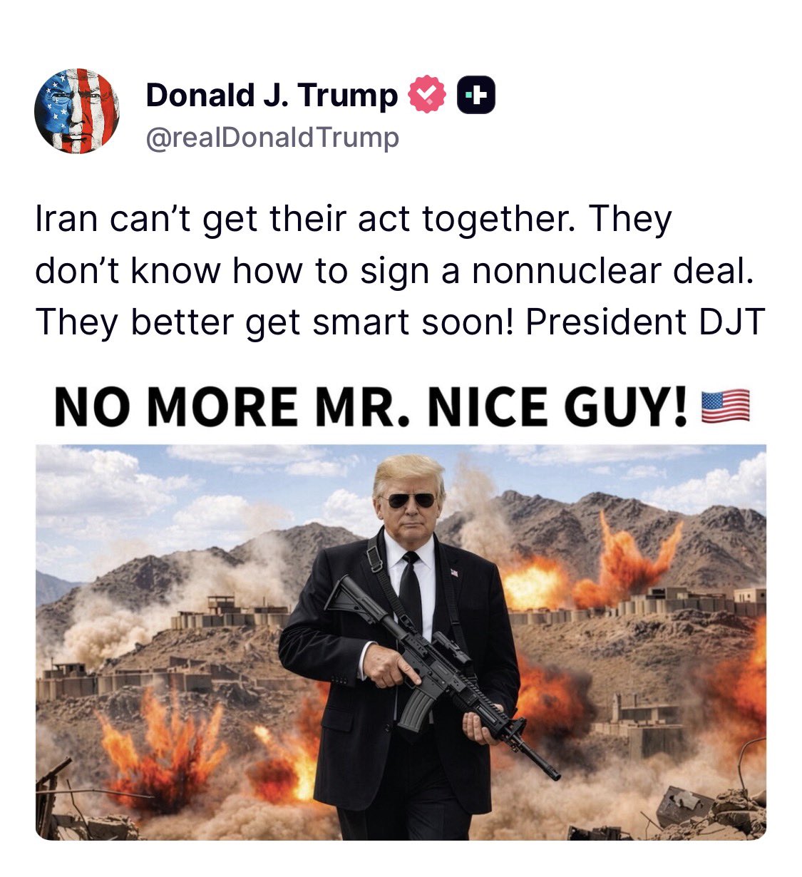 Bununla yanaşı, Tramp sözügedən paylaşıma özünün əlində silah olan və “Artıq həmin yaxşı oğlan yoxdur” ifadəsi qeyd olunmuş fotosunu əlavə edib.