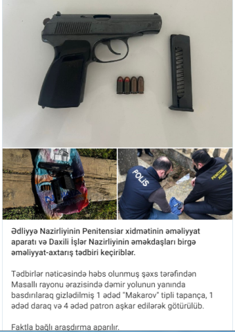 Qanunvehedef.az xəbər verir ki, tədbirlər nəticəsində həbs olunmuş şəxs tərəfindən Masallı rayonu ərazisində dəmir yolunun yanında basdırılaraq gizlədilmiş 1 ədəd "Makarov" tipli tapança, 1 ədəd daraq və 4 ədəd patron aşkar edilərək götürülüb.