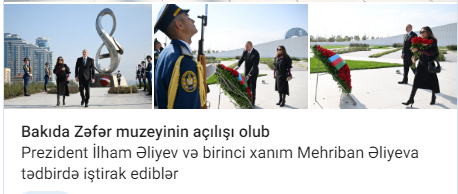 Azərbaycan Prezidenti İlham Əliyev və birinci xanım Mehriban Əliyeva Bakıda Zəfər abidəsini ziyarət edib və Zəfər muzeyinin açılışında iştirak ediblər.