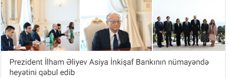 Azərbaycan Prezidenti İlham Əliyev noyabrın 14-də Asiya İnkişaf Bankının prezidenti Masato Kandanın rəhbərlik etdiyi nümayəndə heyətini qəbul edib.