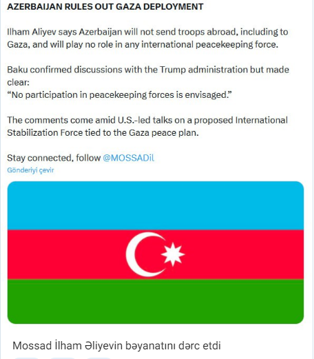 Bəyanatda vurğulanıb ki, Azərbaycan Qəzza da daxil olmaqla, silahlı qüvvələrini ölkə xaricinə göndərmək niyyətində deyil və heç bir beynəlxalq sülhməramlı qüvvələrdə iştirak etməyi planlaşdırmır.