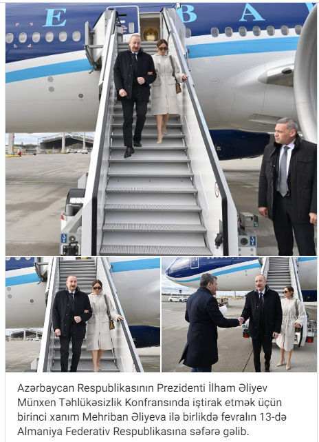Azərbaycan Respublikasının Prezidenti İlham Əliyev Münhen Təhlükəsizlik Konfransında iştirak etmək üçün birinci xanım Mehriban Əliyeva ilə birlikdə fevralın 13-də Almaniya Federativ Respublikasına səfərə gəlib.
