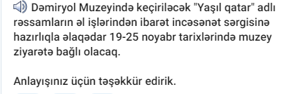 Dəmiryol Muzeyində keçiriləcək "Yaşıl qatar" adlı rəssamların əl işlərindən ibarət incəsənət sərgisinə hazırlıqla əlaqədar 19-25 noyabr tarixlərində muzey ziyarətə bağlı olacaq.